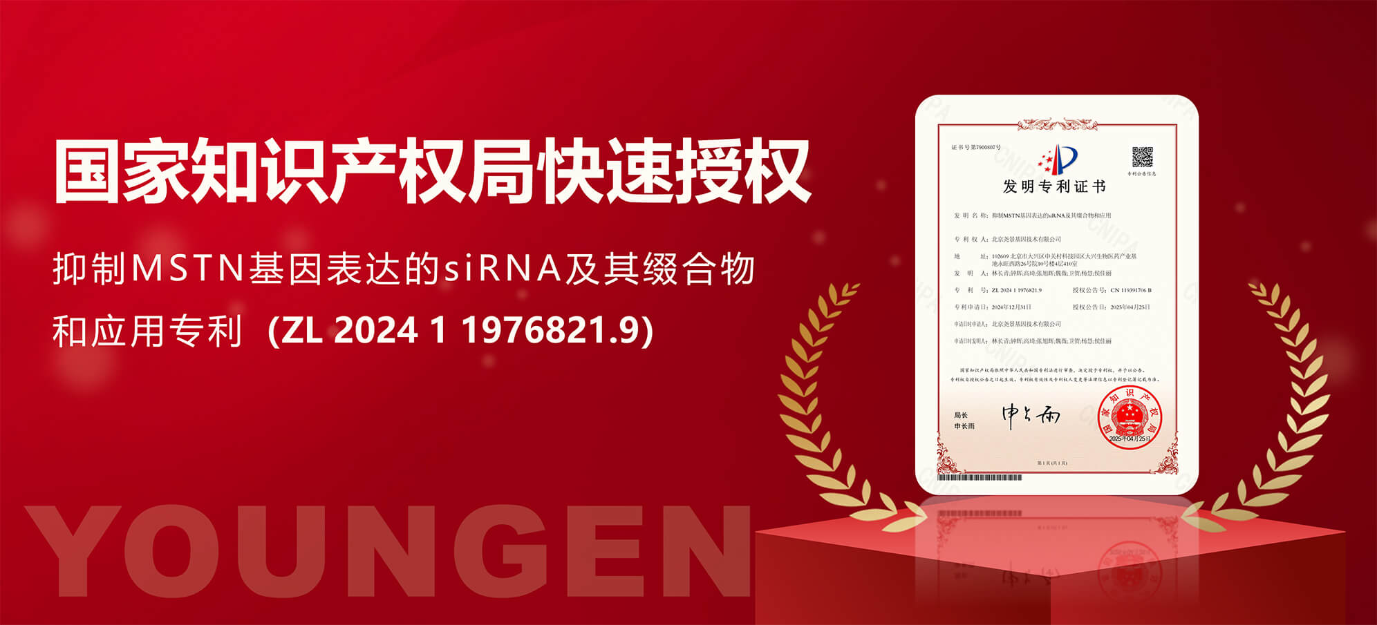 近日,熱景生物參股公司北京堯景基因技術有限公司,被國家知識產權局快速授權了名為“抑制MSTN基因表達...