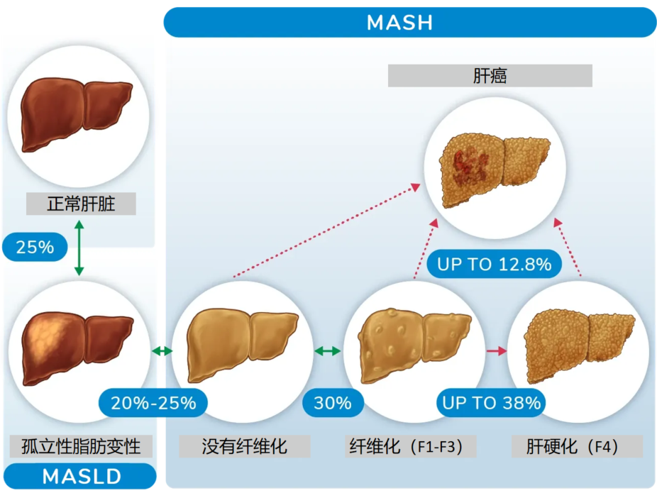MASLD疾病譜包括單純性脂肪肝(MAFL)、脂肪性肝炎(MASH)及其相關纖維化和肝硬化。隨著肥胖和2型糖尿?。═2DM)的流行,全球MASLD患病率和發病率不斷增高。據報道,全球MASLD的發病率約20-35%,其中約10-30%的患者患有MASH。