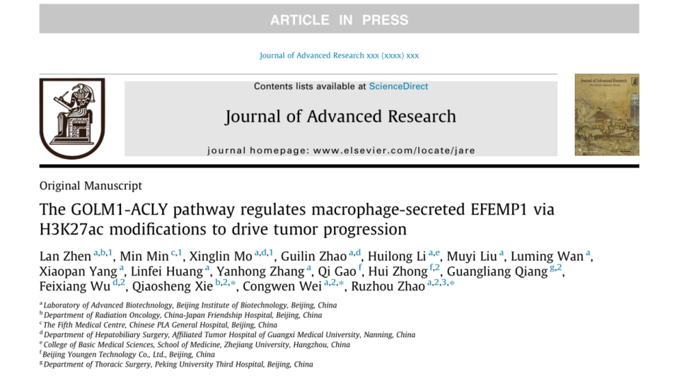 近日,熱景生物參股公司北京堯景基因技術有限公司(簡稱“堯景基因”)聯合北京生物技術研究所、中日友好醫院、廣西醫科大學附屬腫瘤醫院等多家單位,在《Journal of Advanced Research》雜志發表重要研究成果,論文題為《The GOLM1-ACLY pathway regulates macrophage-secreted EFEMP1 via H3K27ac modifications to drive tumor progression》。該研究首次闡明巨噬細胞中 GOLM1-ACLY 軸通過表觀遺傳調控與細胞間信號傳導影響腫瘤進展的分子機制,為癌癥治療提供了全新潛在靶點